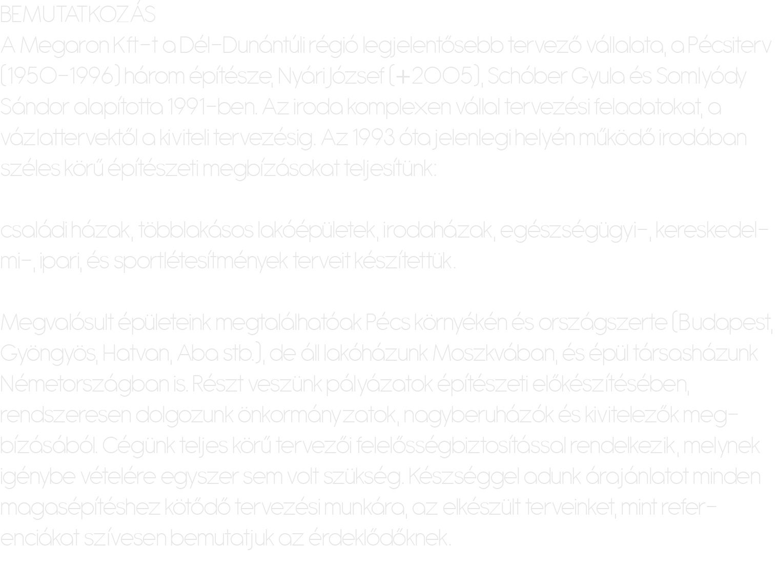 A Megaron Kft-t a Dél-Dunántúli régió legjelentősebb tervező vállalata, a Pécsiterv (1950-1996) három építésze, Nyári József (+2005), Schóber Gyula és Somlyódy Sándor alapította 1991-ben.Az iroda komplexen vállal tervezési fel-adatokat, a vázlattervektől a kiviteli tervezésig. Az 1993 óta jelenlegi helyén működő irodában széles körű építészeti megbízásokat teljesítünk: